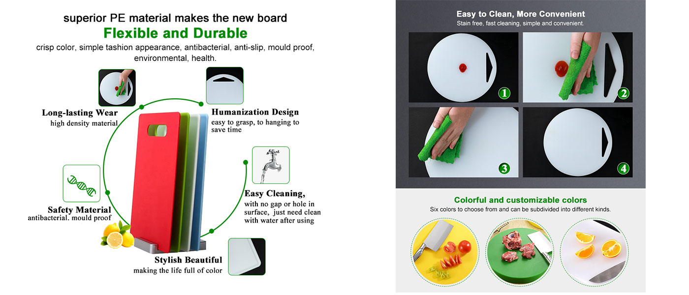 Наша разделочная доска из полиэтилена/ПНД обработана пищевым сырьем, нетоксична и безвкусна, обладает высокой плотностью, высокой прочностью и другими свойствами, длительным сроком службы, не размножает бактерии.
